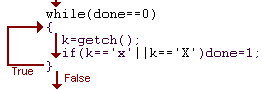 Keep changing the two values in the gotoxy line, re-compile and run the program to see the effects. The second new part shows the while loop. Firstly note the variable called done is set to 0 when it is declared. When the program reaches the line while(done==0) it tests to see if the condition done==0 is true. In this case it is, because the program has initialised the done variable to zero, so it executes the next line or block. In this case it's a block of code because there are curly brackets defining it. It needed to be programmed as a block because more than one statement is needed. Within this block, the program gets the key pressed by the user and stores it in the k variable ( k=getch(); ). It then checks to see if the key pressed is the X key ( if(k=='x'||k=='X') ). This is different to previous examples of the if statement because the or logical operator is used (||). The line can be read as if k equals 'x' or k equals 'X'. If you remember back to the ASCII character set, upper and lower case letters had a different code. If the user of the program has the CAPS LOCK on, then the ASCII code for the upper case X will be stored in the k variable, if not, the ASCII code for the lower case x will be stored there. This program doesn't mind either way as it checks for both by using the || ( 'or' ) logicial operator. More on logical operators in a minute, back to the while loop .. If the user does press the x key then the value of the done variable is set from 0 to 1. If the user doesn't press the x key then the value of the done variable remains at unchanged at 0. After this line the code block is ended, at this point a test is made on the condition of the while statement at the start of the block. If the condition ( done==0 ) is true, then the program goes back to the top of the block and repeats. If the condition ( done==0 ) is false then it "drops out of the while loop" and continues down. The red arrows in the following graphic show the program flow.